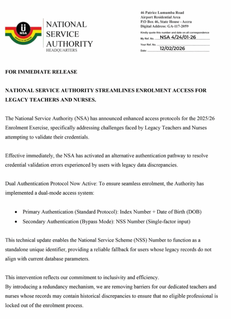 The National Service Authority (NSA) has announced enhanced access protocols for the 2025/26 enrolment exercise, introducing a new authentication pathway aimed at resolving credential validation challenges faced by legacy teachers and nurses.