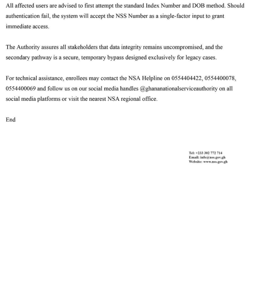 “All affected users are advised to first attempt the standard Index Number and Date of Birth method,” the statement said. “Should authentication fail, the system will accept the NSS Number as a single-factor input to grant immediate access.”
