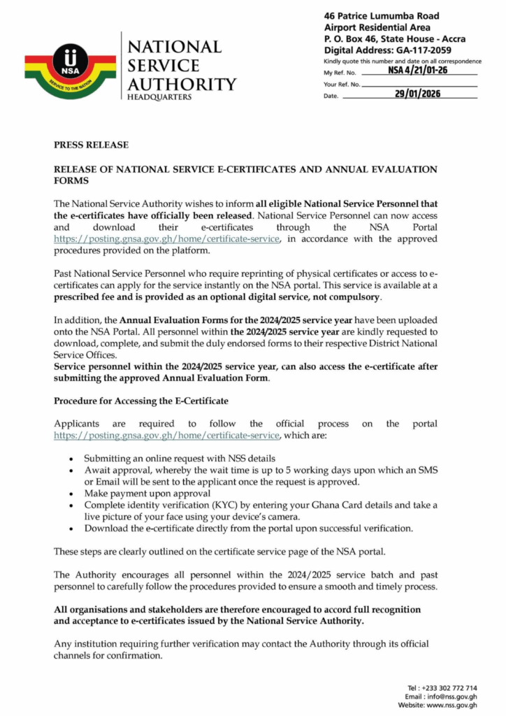 In a press statement issued on Thursaday, January 29, the Authority informed all eligible National Service Personnel that the e-certificates have now been officially released and can be accessed through the NSA portal at https://posting.gnsa.gov.gh/home/certificate-service, in line with the approved procedures outlined on the platform.