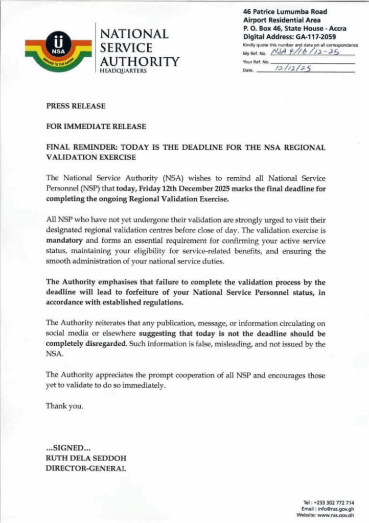 The National Service Authority (NSA) has reminded all National Service Personnel (NSP) that today, Friday December 12, 2025, is the final deadline for completing the ongoing Regional Validation Exercise.
