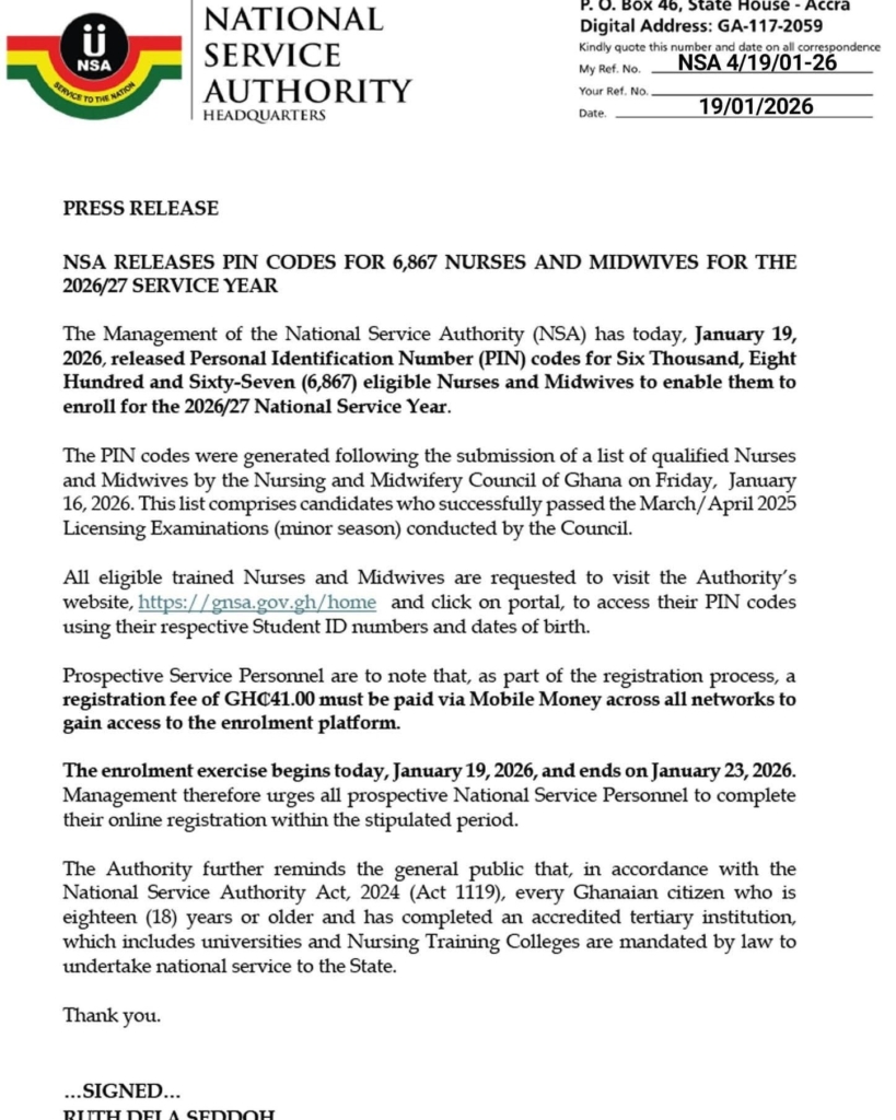The National Service Authority (NSA) has announced Thursday, January 23, 2026, as the final day for nurses and midwives who completed their studies in 2025 to enrol for the 2026/2027 national service year.