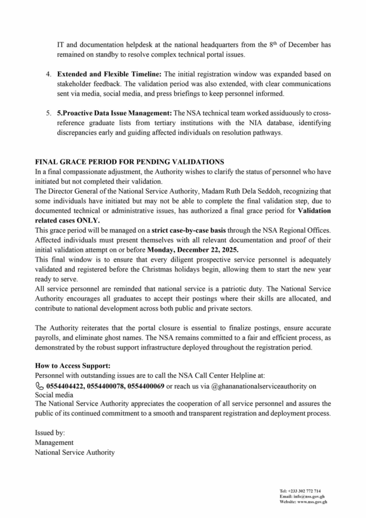 The National Service Authority (NSA) has announced that its registration portal for the 2025/2026 national service year will close on Monday, December 22, following several deadline extensions aimed at accommodating all eligible graduates.