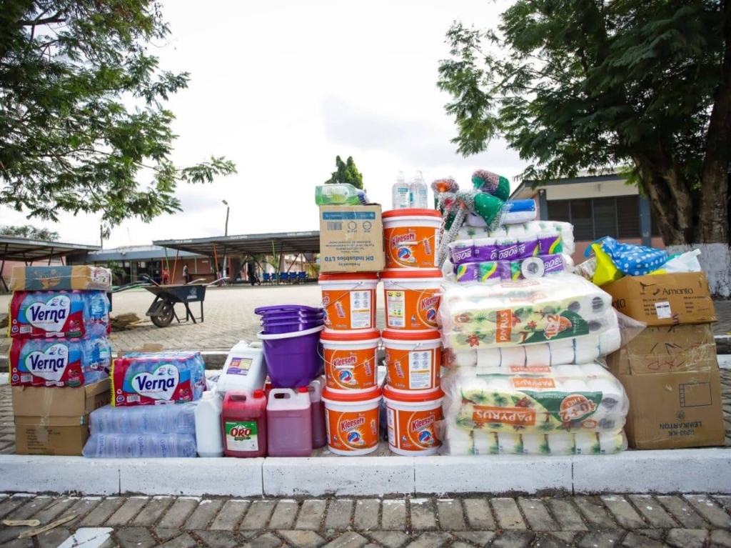Items presented included toilet rolls, detergents, sanitary pads, drinks, mop buckets, mop sticks, assorted food items, chocolates, bottled water, tissue paper, and other essential supplies to support the ward’s daily operations.