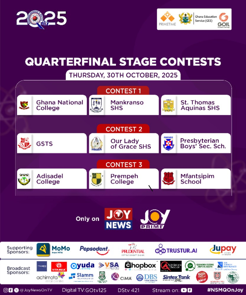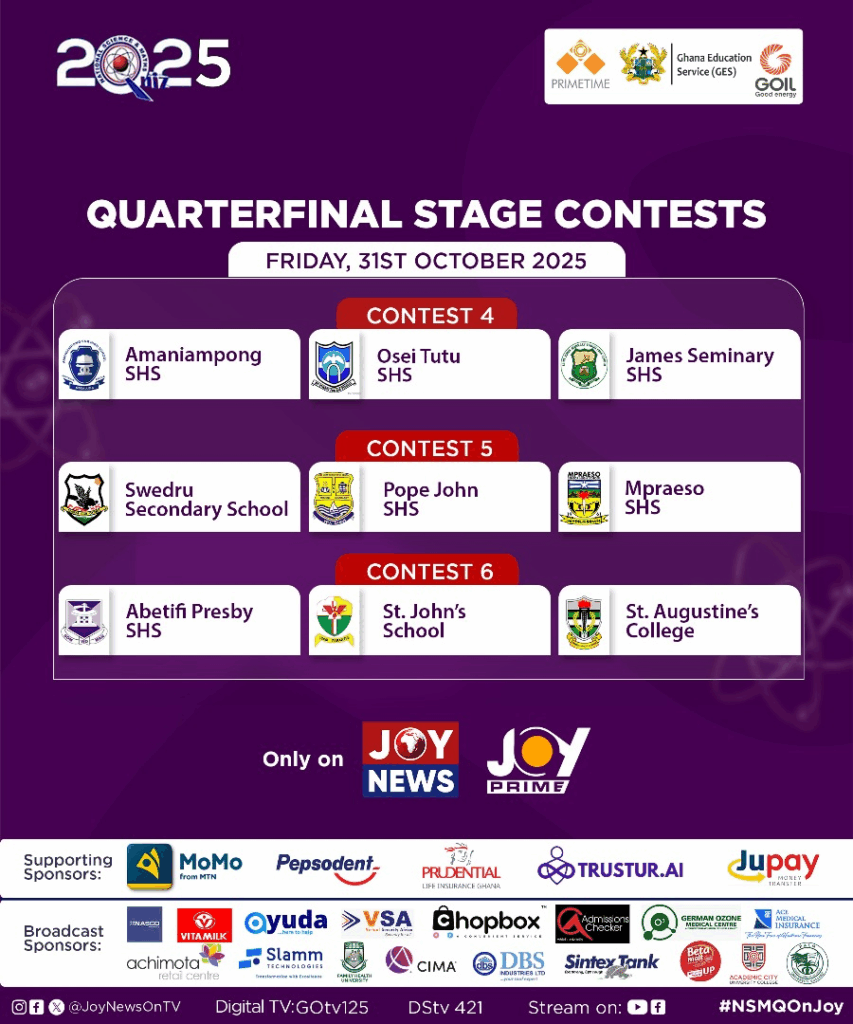 Drawn into nine contests of three schools each, the 2025 NSMQ quarterfinals promise a spectacular display of speed, precision, and brilliance as the nation’s best schools face off in fierce competition at the national stage.