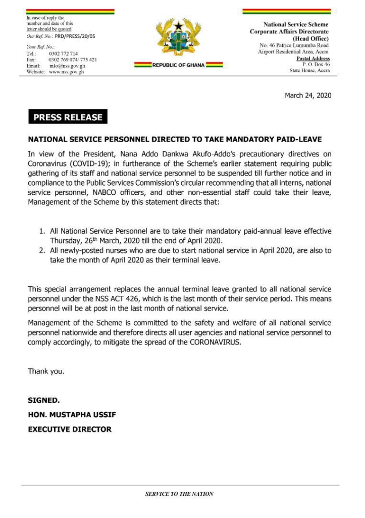 The National Service Secretariat (NSS) has directed all 2019/2020 National Service Personnel to take their one month mandatory paid leave starting Thursday, March 26.