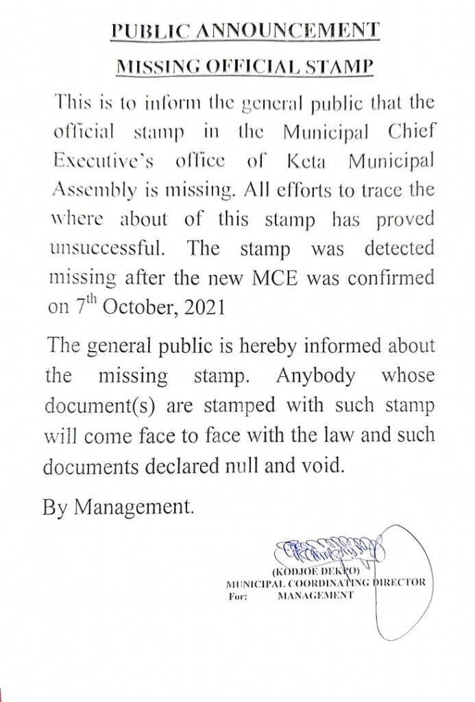 The Authorities of the Keta Municipal Assembly have announced that all documents that bear the official stamp of the Chief Executive of the Assembly, dated Thursday, October 7, or laterr, are null and void.