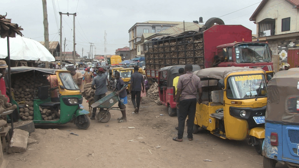 “During the rainy season, cars cannot pass. In the dry season, the dust is too much,” said Sarah Gyebi, a trader at the market. “The dust affects our health, and the mud makes it hard for customers to come.”