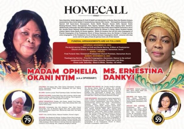 Nana Akyemfour Asiedu Agyemang III, Chief of Abetifi and Adontenhene of Kwahu, Nana Kusi Buodom Ameyaw, Aseseesohene, Nana Amma Adobea II, Aseseesohemaa, Opanyin Ofori Asante – Werempehene, Akasease(father), Opanyin Kofi Gyane- Asona Abusuapanyin, Kwahu Abetifi, Okyeame Kwame Adofo, Opanyin Kwaku Boateng-Akasease Bretuo Abusuapanyin, Nana Oppong Kyekyeku (Major (Rtd.) Oppong Ayisi) Sanahene, Abetifi -Kwahu, Ambassador Alex Ntim Abankwa (Abusuapanyin), Nana Preko, Head of Abetifi Community in Accra, , Mrs. Dorothy Danso, National President of Women’s Aglow, Opanin. Kwabena. Nimako. father, Opanin. Kwaku Bamfo, Mr Kwame Agyakwa  Bobito, and Mr Kwabena. Osei, the Minister in Charge and the entire Congregation of Priscilla Congregation of the Presbyterian Church of Ghana, Dansoman, Accra, the Minister in Charge and the entire Congregation of the Presbyterian Church of Ghana, Ramseyer Congregation, Abetifi: announce with deep sorrow and to the glory of God, the home call of their beloved MADAM OPHELIA OKANI NTIM. (a.k.a OPHYBABY) AND MADAM ERNESTINA DANKYI
