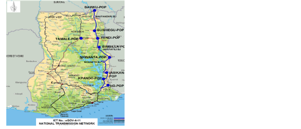 - About 1000km of Rural Fiber Network from Accra to Bawku which connects six regions in the country; namely: Greater Accra, Volta, Oti, Northern, North East and Upper East regions. This provides the internet and voice call needs of millions of Ghanaians and thousands of businesses along that route. Furthermore, at no additional cost to the State, this fiber network was also extended to the University of Health and Allied Sciences (UHAS) to facilitate research, teaching and learning.