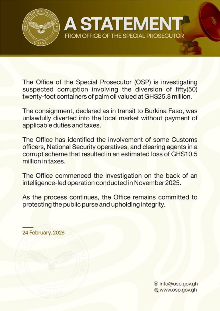 Office of the Special Prosecutor (OSP) has launched an investigation into a suspected corruption scheme involving the illegal diversion of 50 20-foot containers of palm oil, valued at GHS25.8 million, into the local market.