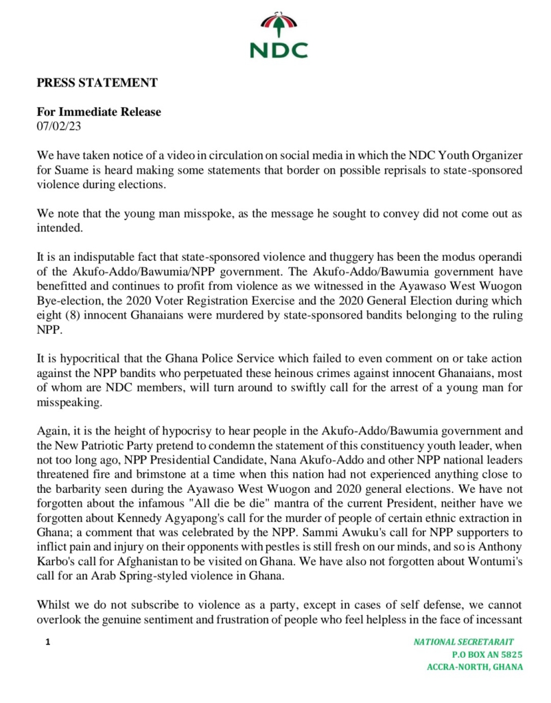 The NDC Youth Organiser in Suame is reported to have made statements that border on possible reprisals to state-sponsored violence during elections.