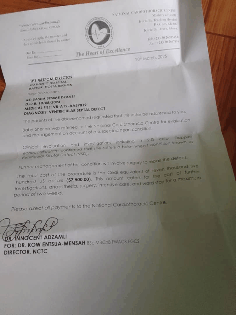 Medical reports from the NCTC confirm that the baby, Sasha Sesime Dzansi, born on October 8, 2024, has been diagnosed with Ventricular Septal Defect (VSD)—a serious congenital condition commonly referred to as a “hole in the heart.”