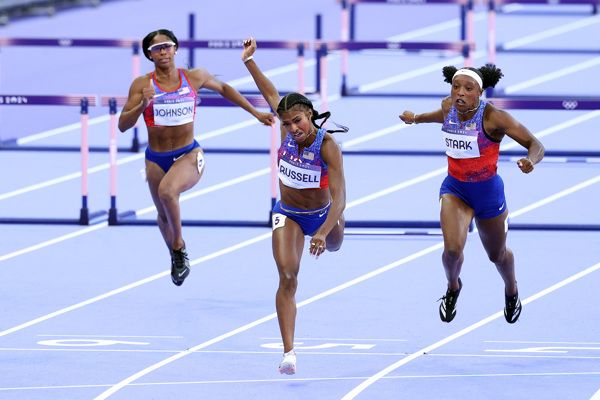 In the final Russell lined up in lane five, next to her teammates Stark and Johnson. Russell knocked the second hurdle but didn’t seem to lose too much momentum, but Johnson hit the next barrier hard, ending her medal hopes.