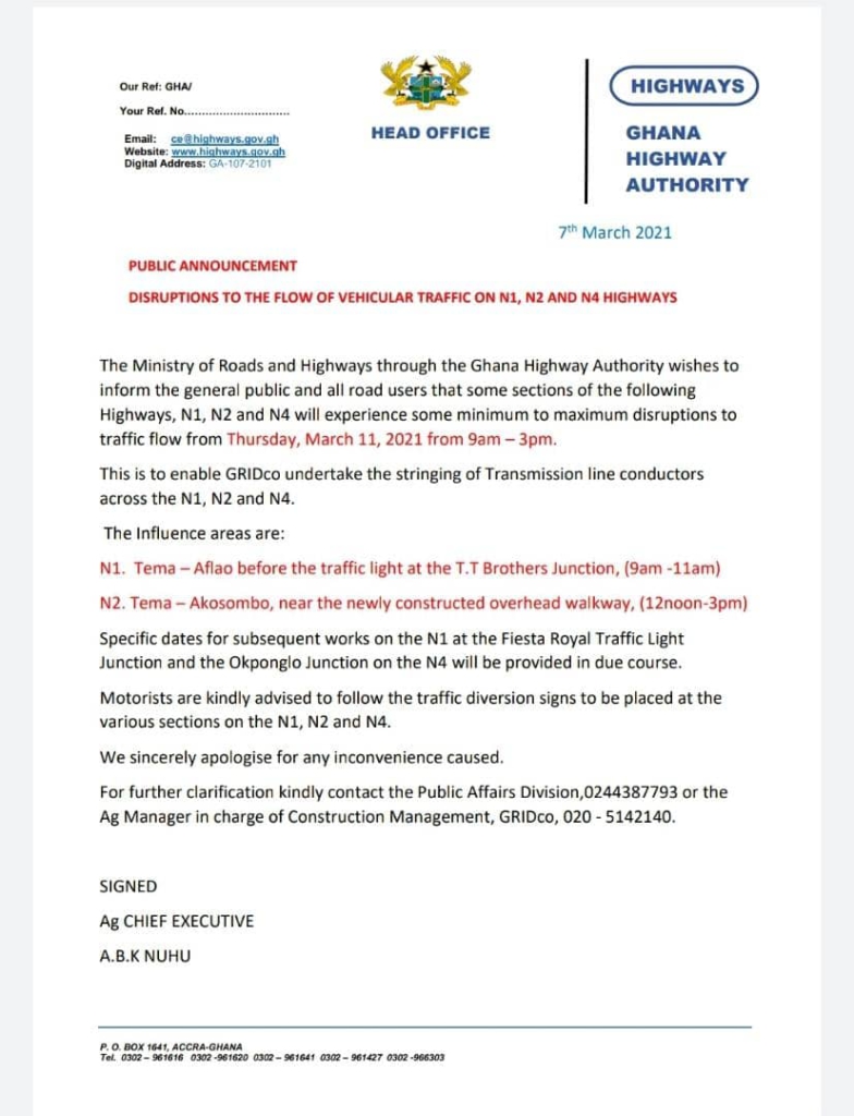 "This is to enable GRiDCo undertake the stringing of transmission line conductors across the N1, N2, and N4," a statement signed by Chief Executive Officer at the Ghana Highway Authority, A.B.K Nuhu said.