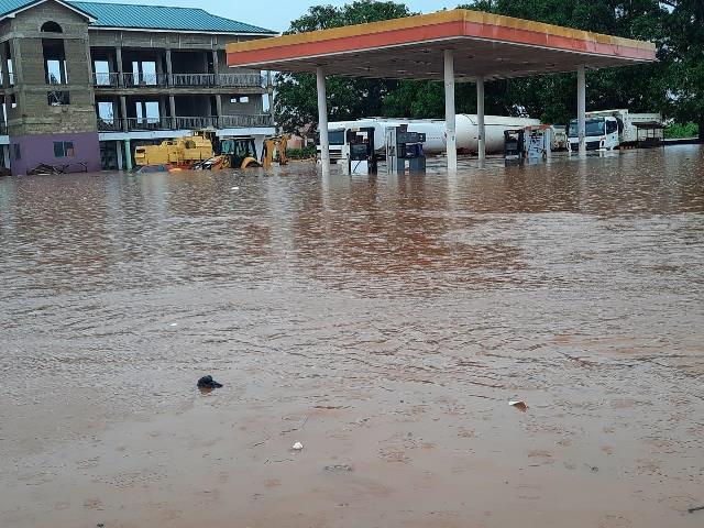 The Frimps fuel station at Vittin seemed to be the biggest facility to be affected as the water level on its yard reached the abdomen level partially submerging vehicles parked at the yard, including fuel tankers, tipper trucks and saloon cars.