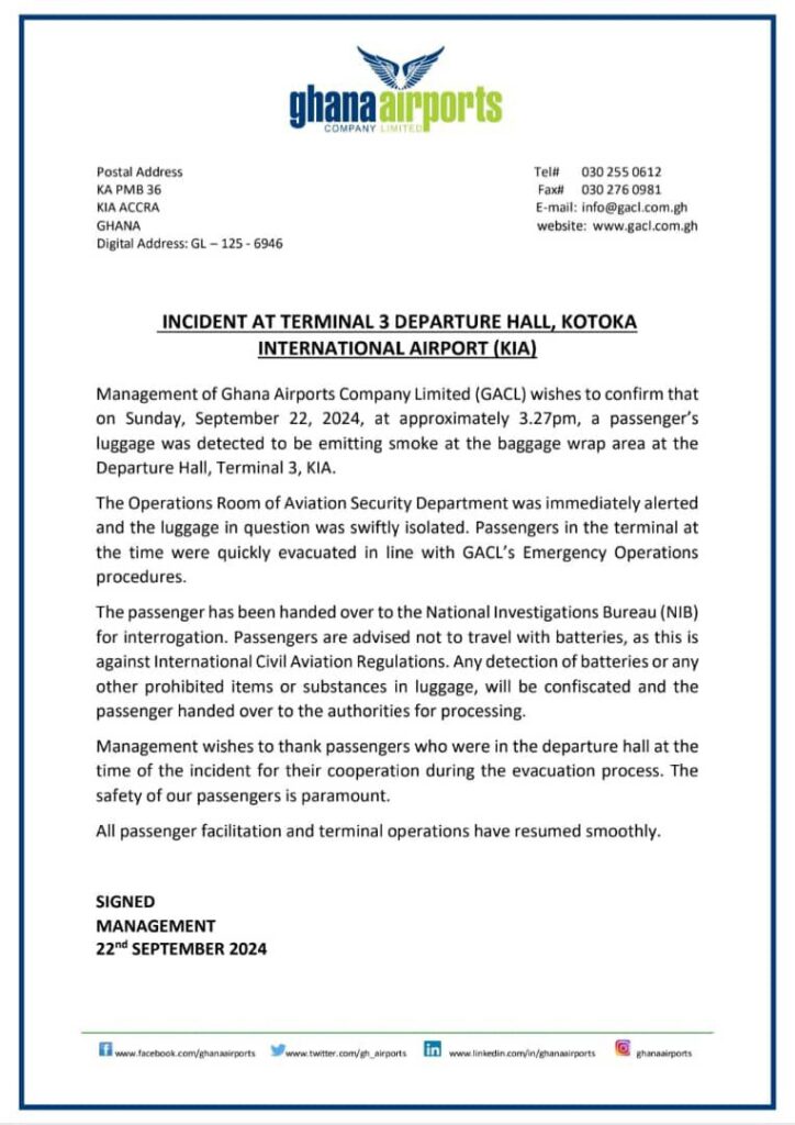 The statement said, “The security team swiftly isolated the bag, and passengers in the terminal were evacuated as per the Ghana Airports Company Limited’s (GACL) Emergency Operations procedures.”