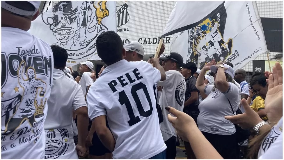 On Tuesday, supporters' club Torcida Jovem gathered outside the Urbano Caldeira stadium ahead of the casket leaving. Fans waved huge black and white banners, the colours of Santos Football Club. Many wore the number 10 shirt that Pele made so famous.