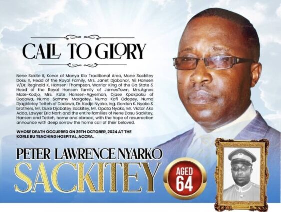Nene Sakite II, Konor of Manya Klo Traditional Area, Mane Sackitey Dosu II, Head of the Royal family, Mrs. Janet Djabanor, Nii Hansen V/Dr. Reginald K. Hansen-Thompson, Warrior King of the Ga State & Head of the Royal Hansen family Jamestown and the entire families of Nene Dosu Sackitey, Hansen and Tetteh, Home and abroad, with the hope of resurrection, announce with deep sorrow the home call of their beloved.