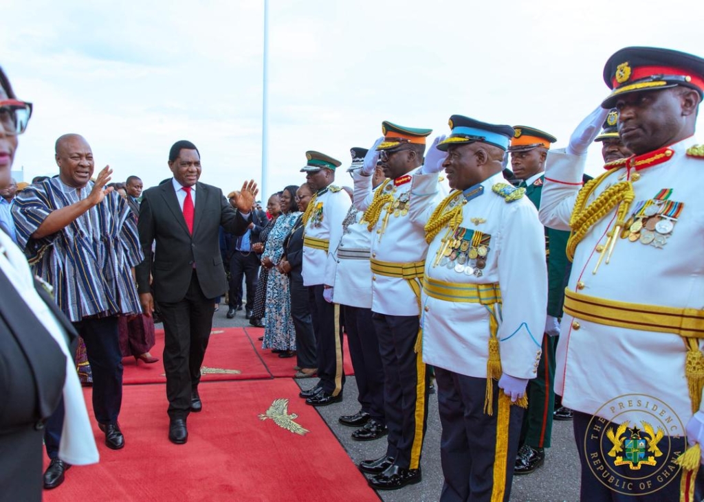 The president and the First Lady were received on arrival at the Kenneth Kaunda International Airport by President Hichilema and the First Lady, in a ceremony marked by cultural displays and a strong show of Ghanaian pride.