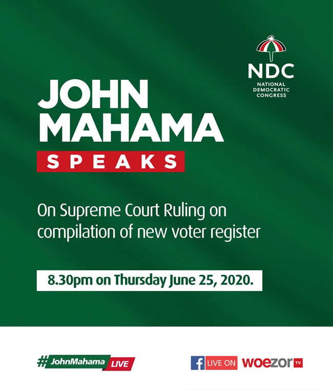 The presidential candidate of the opposition National Democratic Congress (NDC), John Mahama will address a press briefing organized by the party to react to the Supreme Court’s ruling on the compilation of a new voter’s register.