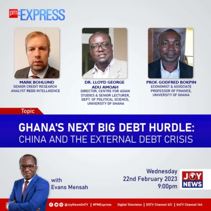 Guests for Wednesday night’s discussion on Ghana’s next big debt hurdle to assessing the way forward are; Senior Credit Research Analyst Redd Intelligence, Mark Bohlund, Director of Centre for Asian Studies, Dr Llyoyd George Adu Amoah and Economist, Prof. Godfred Bokpin.