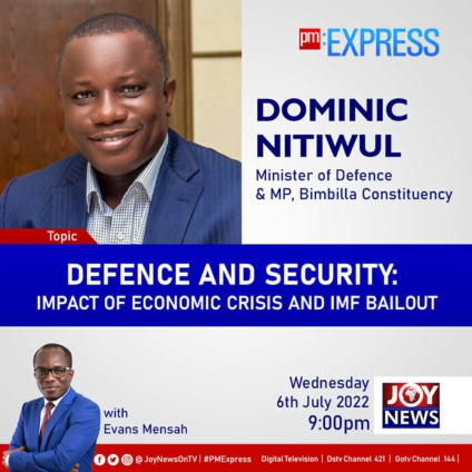 Tonight on PM Express, host, Evans Mensah, will be joined by the Minister of Defence, Dominic Nitiwul, to discuss possible implications of Ghana's economic crisis and IMF bailout on the defence and security of this country.