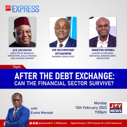 Guests for Monday night’s discussion are; Director of Business Operations at Dalex Finance and Leasing Company, Joe Jackson, Banking Consultant, Dr Richard Atuahene and Lawyer and Convener of Individual Bondholders Association, Martin Kpebu.