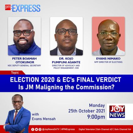 Tonight on JoyNews, host of PM Express, Evans Mensah and his panelists discussed the position of the EC and whether former President Mahama is on a quest to malign the Commission.
