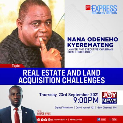Tonight on JoyNews, host of PM Express Business Edition, George Wiafe interacted with Lawyer and Executive Chairman of Comet Properties, Nana Odeneho Kyeremateng to discuss the challenges citizens face when acquiring land or renting a space.