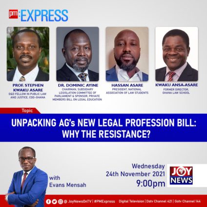 Tonight on PM Express, JoyNews’ Evans Mensah will host D and D Fellow in Public Law and Justice CDD-Ghana, Prof Stephen Kwaku Asare, Chairman of Subsidiary Legislation Committee of Parliament and Sponsor, Private Members Bill on Legal Education, Dr Dominic Ayine, President of National Association of Law Students, Hassan Asare and Former Director of Ghana Law School, Kwaku Ansa-Asare to discuss the AG’s new legal profession bill.