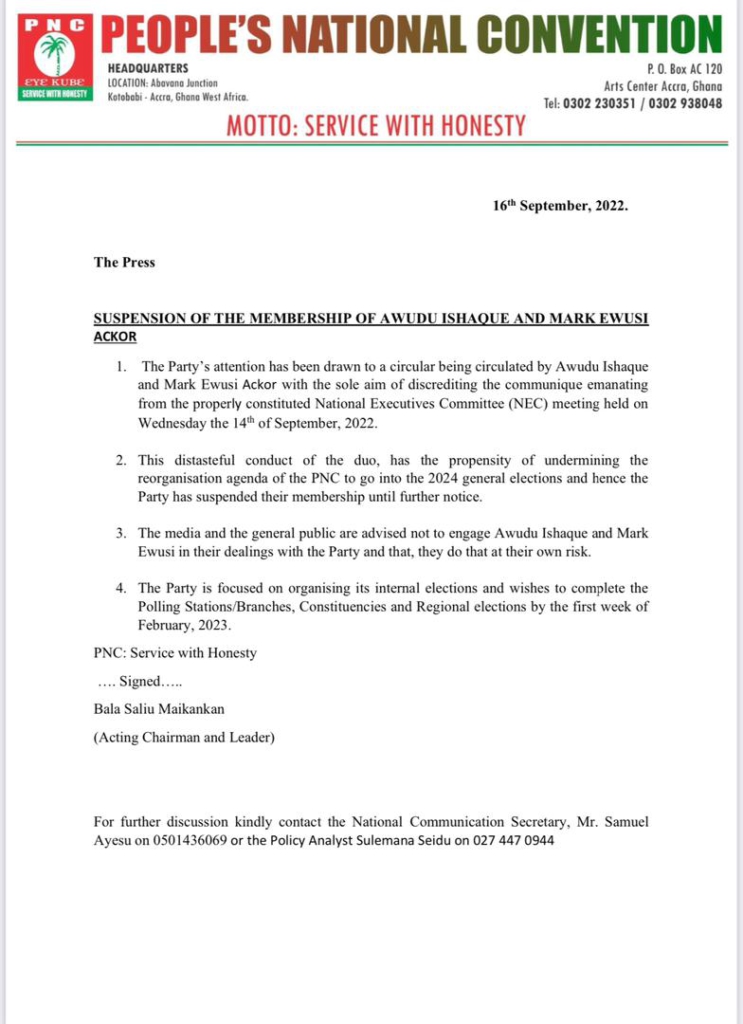 The People’s National Convention (PNC) has suspended two of its members, namely; Awudu Ishaque and Mark Ewusi Ackor.
