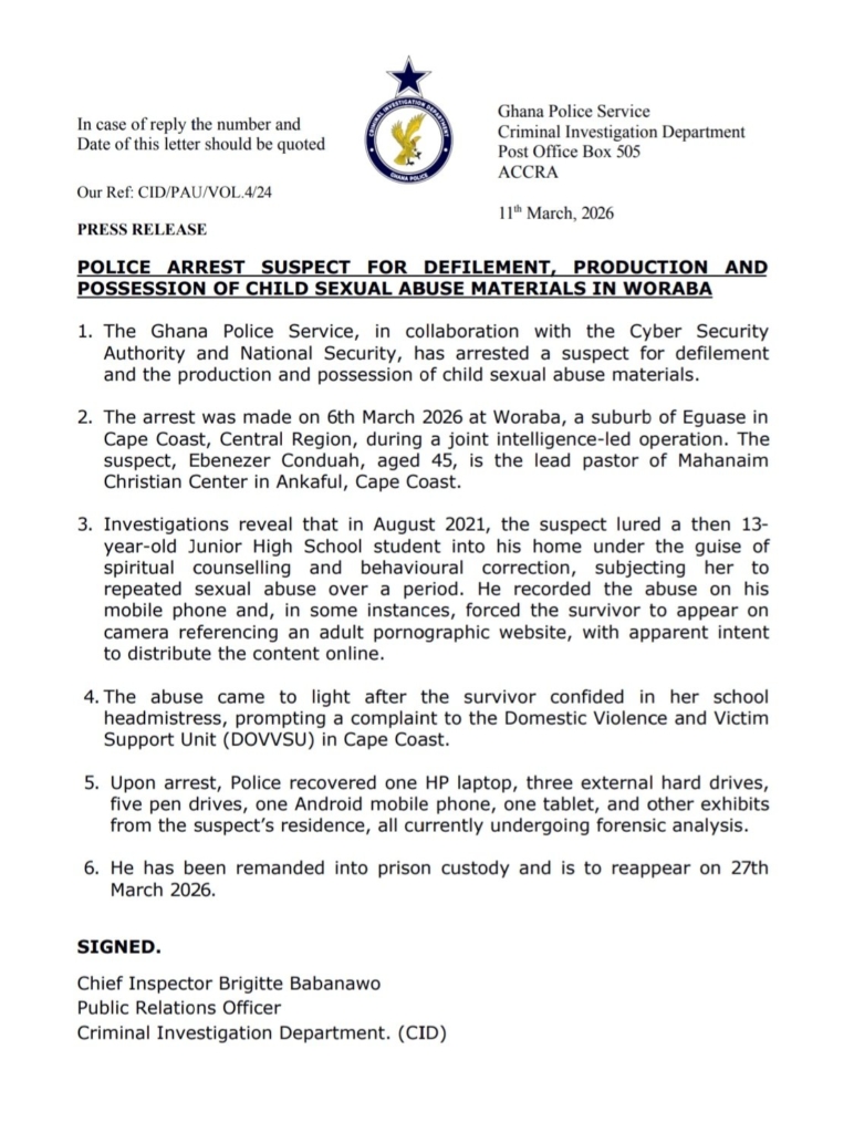 According to the police, investigations reveal that in August 2021, Conduah lured a then 13-year-old Junior High School student into his home under the guise of "spiritual counselling and behavioural correction, subjecting her to repeated sexual abuse over a period."