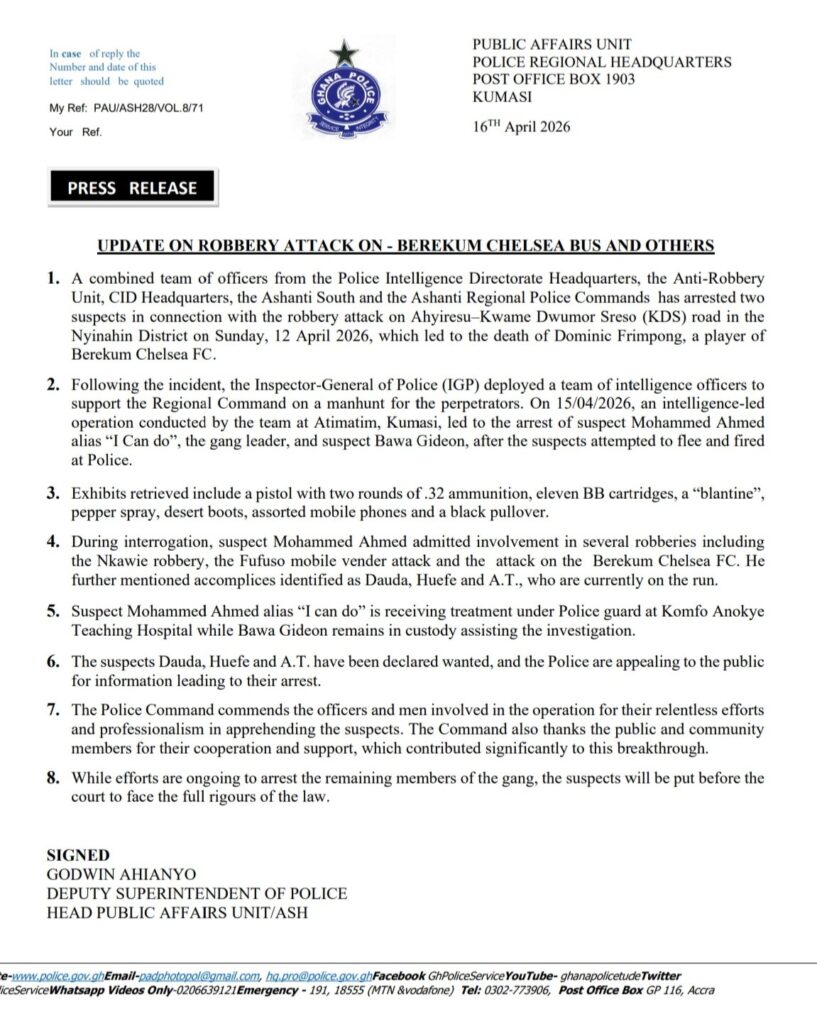 The team has so far arrested two suspects in connection with the attack, which occurred on Sunday, April 12, 2026, in the Nyinahin District and resulted in the death of Dominic Frimpong, a player of Berekum Chelsea FC.
