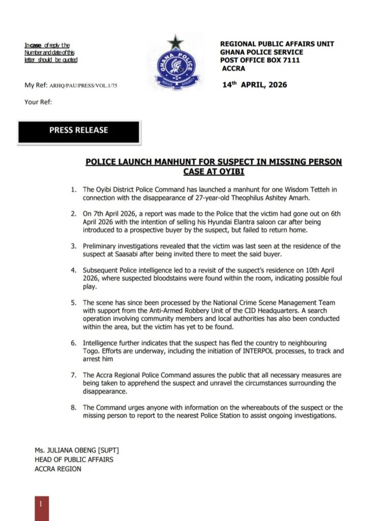 Investigators have also received intelligence suggesting that the suspect may have fled Ghana to neighbouring Togo. Police say processes have begun, including engagement with INTERPOL, to track and arrest him.