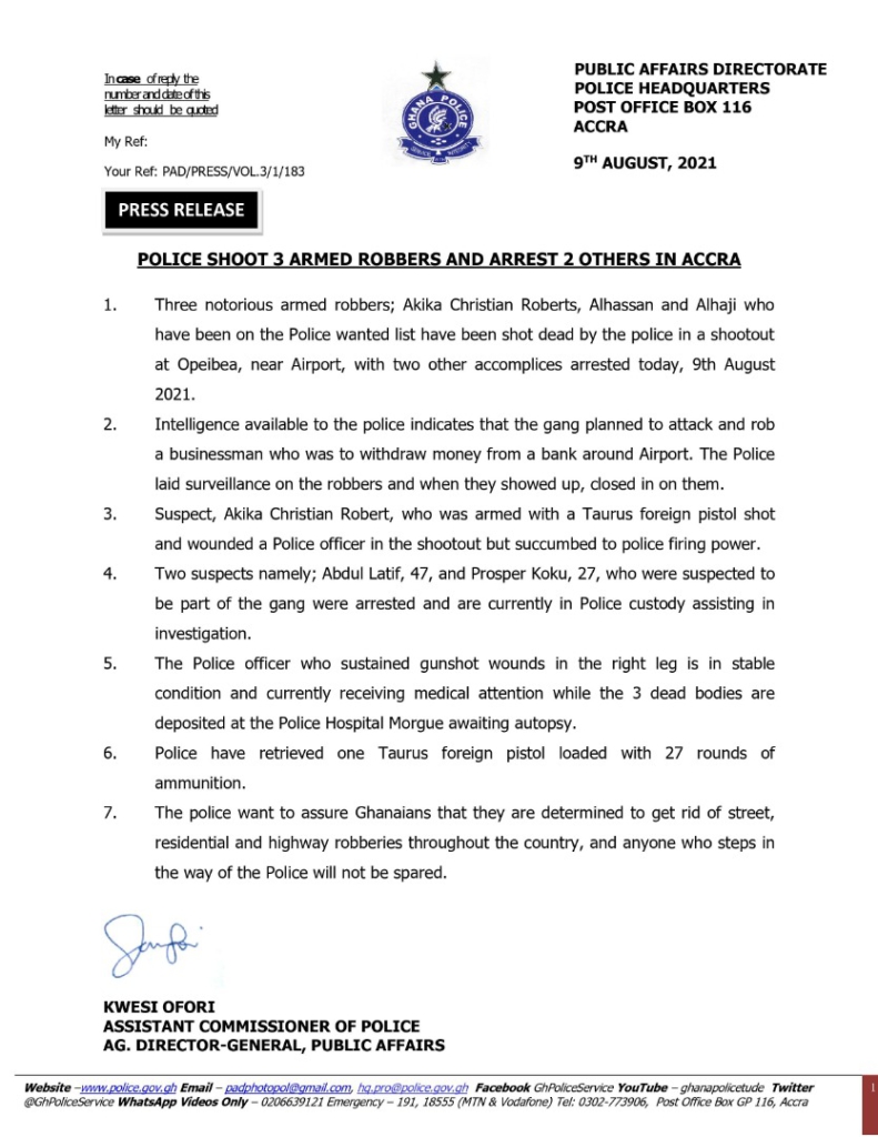 A statement from the Police, signed by Assistant Commissioner of Police (ACP) Kwesi Ofori, Acting Director-General, Public Affairs Unit of the Accra Regional Police Command, said intelligence available to the Police indicated that the gang planned to attack and rob a businessman who was to withdraw money from a bank around Airport.