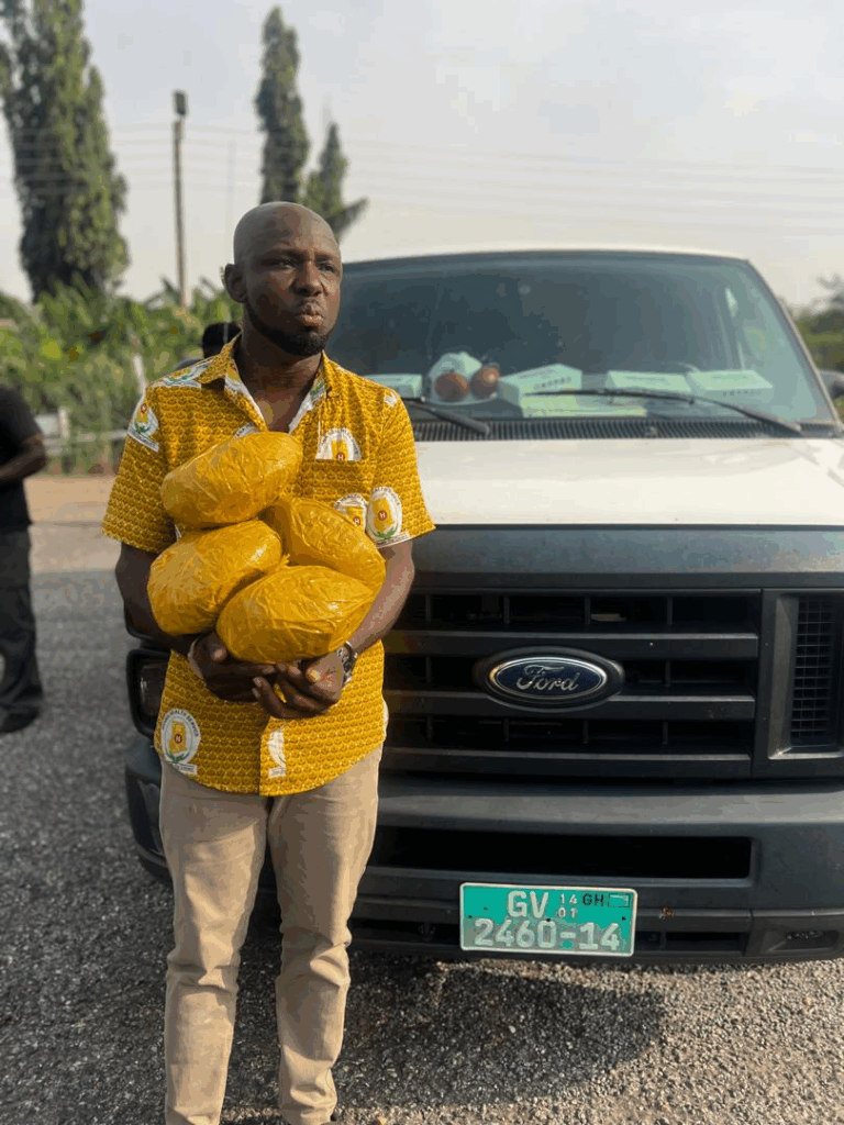 A search conducted in the presence of the suspect, identified as 38-year-old Godsway Kwaku Dogbey, an employee of the Ghana Health Service Directorate in Ho, uncovered 26 maxi sacks containing 2,045 yellow oval-shaped wrapped compressed leaves suspected to be Indian hemp.