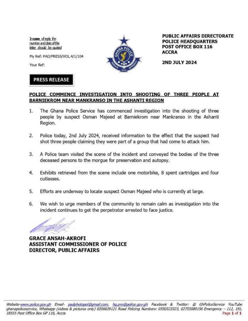 The Ghana Police Service has begun an investigation into the shooting of three individuals by suspect Osman Majeed at Barniekrom, near Mankranso in the Ashanti Region.