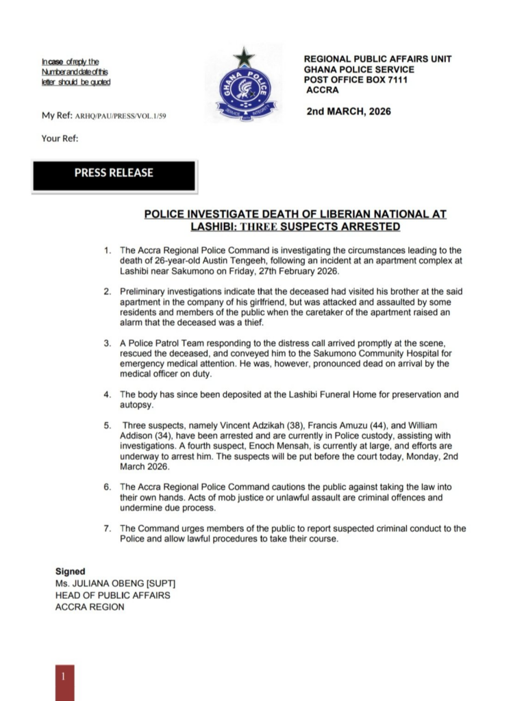 The Accra Regional Police Command is investigating the death of 26-year-old Austin Tengeeh, a Liberian national, following an incident at an apartment complex in Lashibi near Sakumono on Friday, 27th February 2026.