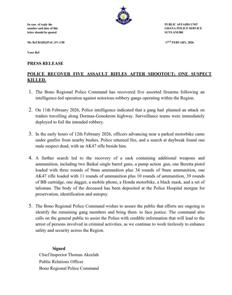 In a press release dated February 17, 2026, the Bono Regional Police Command said police intelligence on February 11 indicated that a robbery gang was planning to attack traders along the Dormaa–Gonokrom highway.
