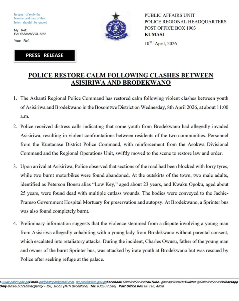 In a statement released on April 10, 2026, the Police said the incident occurred on Wednesday, April 8, 2026, around 11:00 a.m., after distress calls indicated that some youth from Brodekwano had allegedly invaded Asisiriwa, leading to violent confrontations.