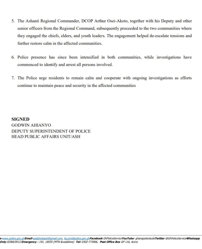 The Ashanti Regional Commander, DCOP Arthur Osei-Akoto, together with senior officers, later engaged chiefs, elders, and youth leaders of both communities to help de-escalate tensions and restore calm.