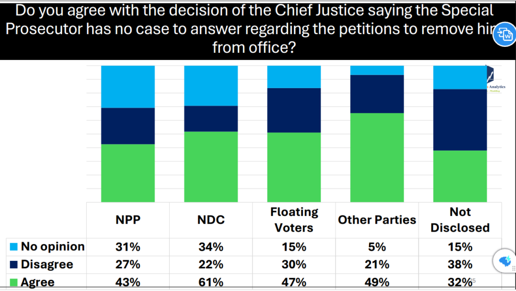On the Special Prosecutor, 48% of all respondents backed the Chief Justice’s conclusion that Kissi Agyebeng had no case to answer.
