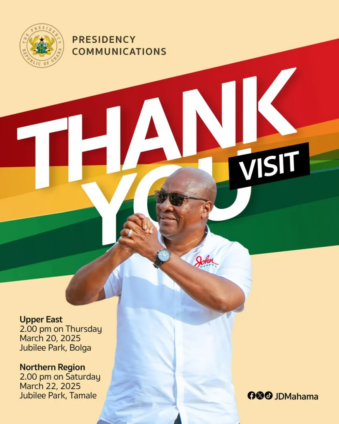 President John Dramani Mahama will today, March 20, commence a thank-you tour of the Upper East and Northern Regions to express his gratitude to the Chiefs and people for their overwhelming support during the 2024 general elections.
