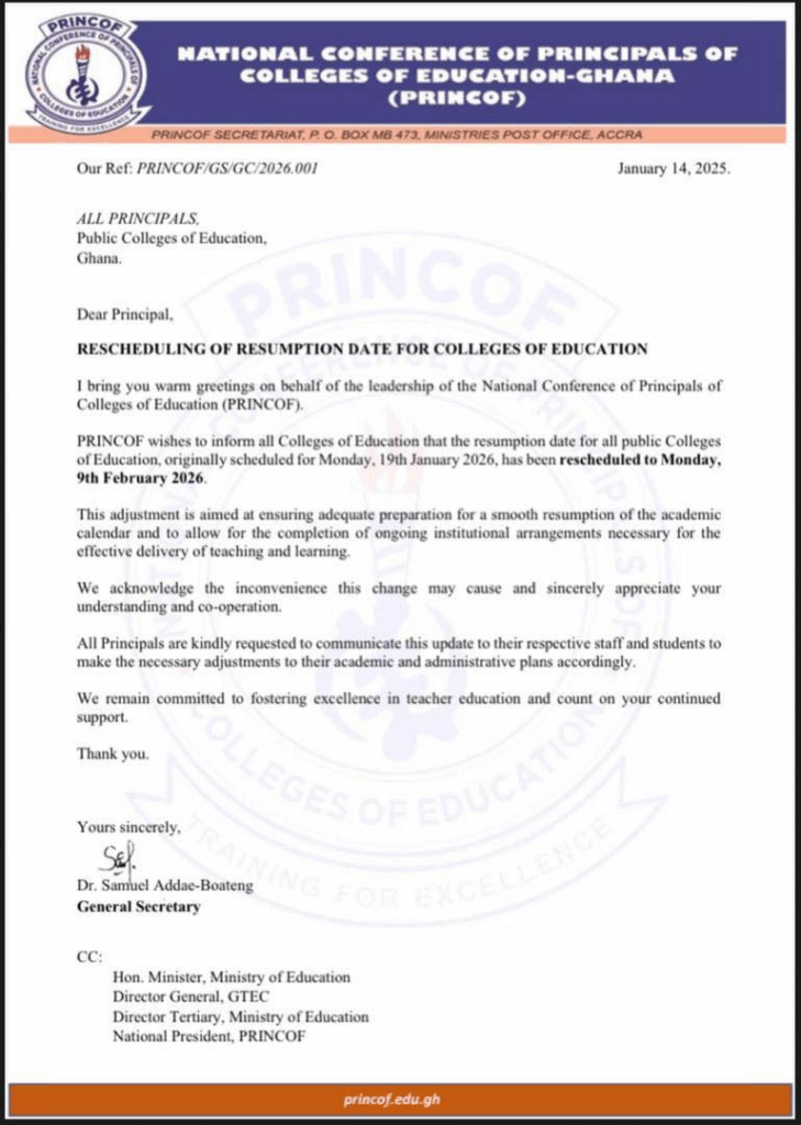 The National Conference of Principals of Colleges of Education (PRINCOF) has announced a revision to the resumption date for all public Colleges of Education across the country, pushing it from the initially scheduled Monday, 19th January, 2026, to Monday, 9th February, 2026.