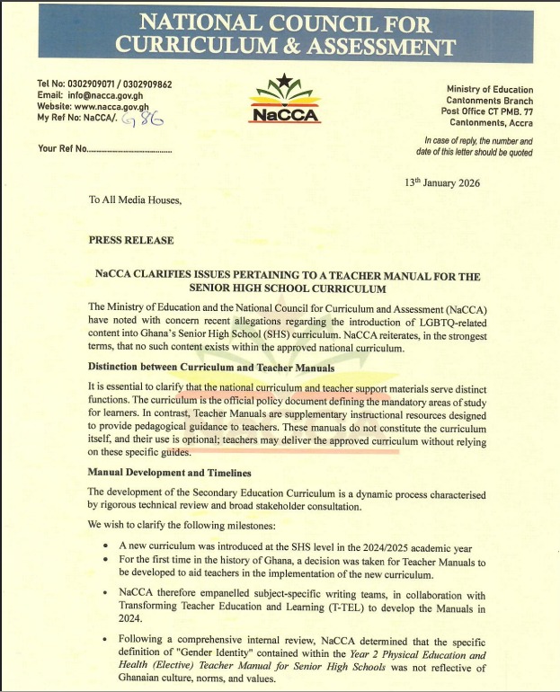 The National Council for Curriculum and Assessment, in its press release dated 13th January, 2026, noted that the definition of “Gender Identity” contained within the Year 2 Physical Education and Health (Elective) Teacher Manual was not reflective of Ghanaian culture, norms, and values, emphasising that the national curriculum itself contains no such content.