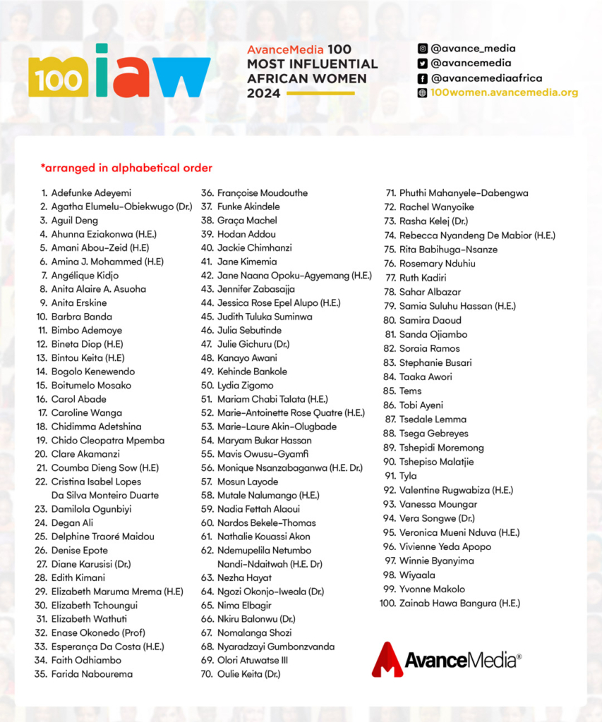 The comprehensive profiles of the 2024 100 Most Influential African Women can be accessed at 100women.avancemedia.org.