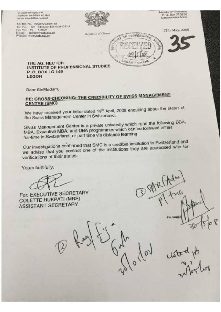 This included verification and confirmation from the then National Accreditation Board, now GTEC, as well as an additional check with the Swiss Embassy in Ghana, followed by direct institutional verification in Switzerland.