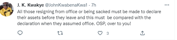 “All those resigning from office or being sacked must be made to declare their assets before they leave and this must be compared with the declaration when they assumed office. OSP, over to you!"