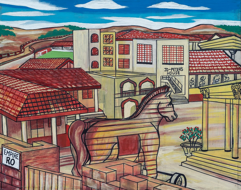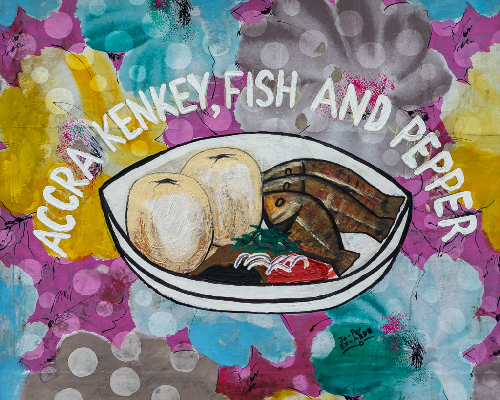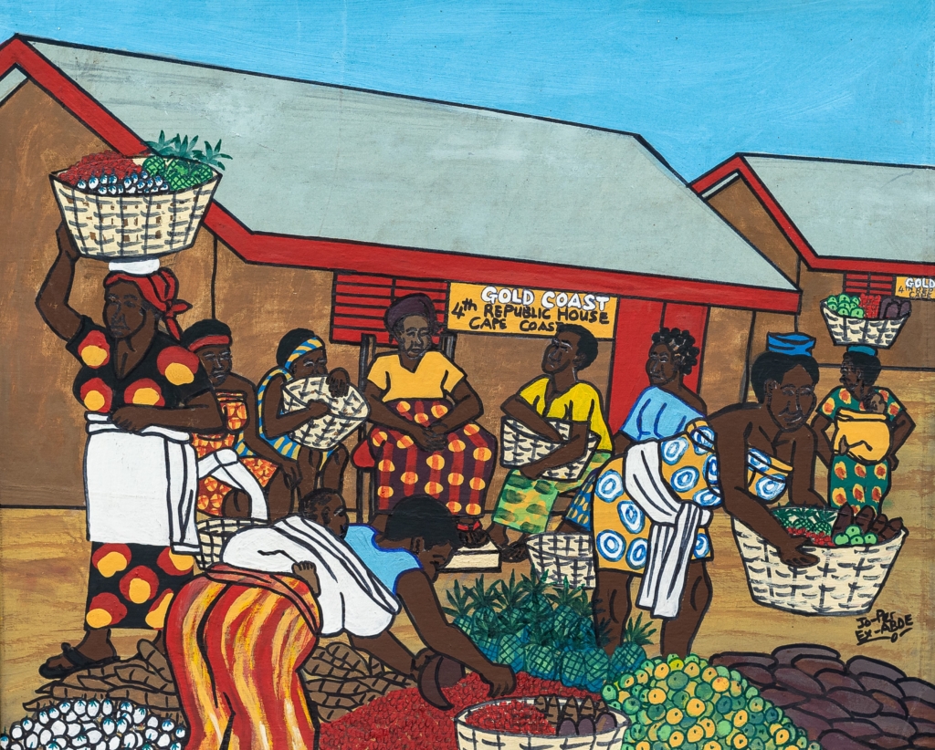 The paintings explore global Ghanaian histories and hospitals; trade & travel, science & technology; syncretic spiritualities and knowledge systems; and Jojo’s own avatars. There is a special focus on Ga culture at the intersection of urban and rural life, and Ghana in changing states of governance and ecology.