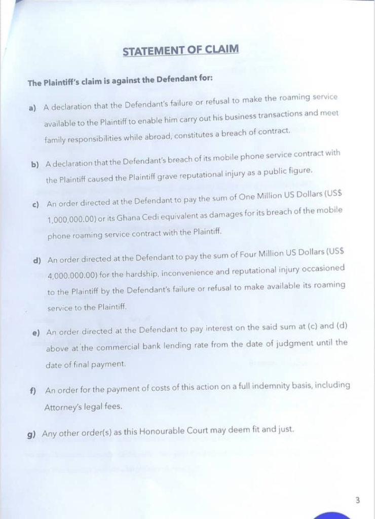 He is therefore demanding $5 million in compensation for the "loss of business opportunities, inconvenience, hardship, and embarrassment caused by MTN Ghana’s failure to resolve its network challenges."